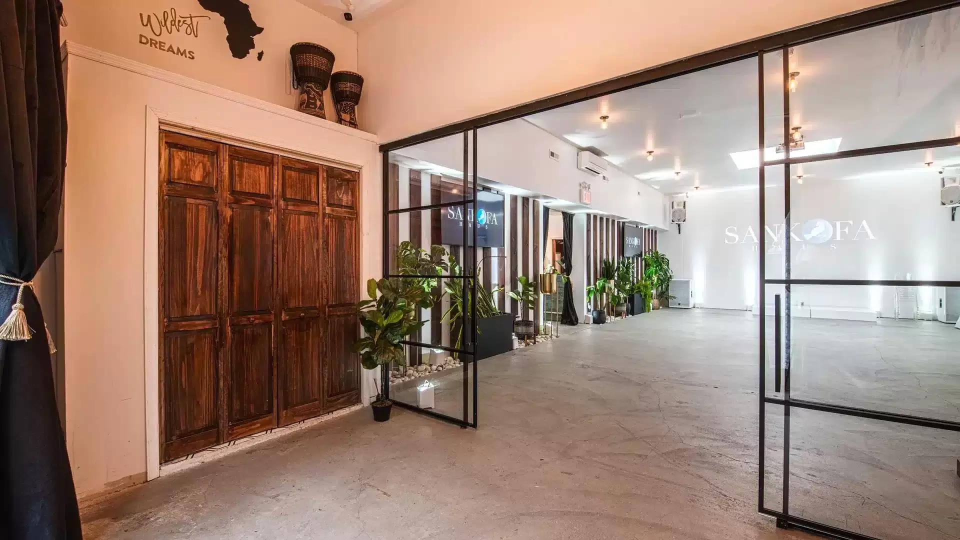 - The Sankofa Private Suite: Velvet Curtains for added privacy, seating for 7 guests, a coded safe to secure important items, separate coat storage, and bar cart.